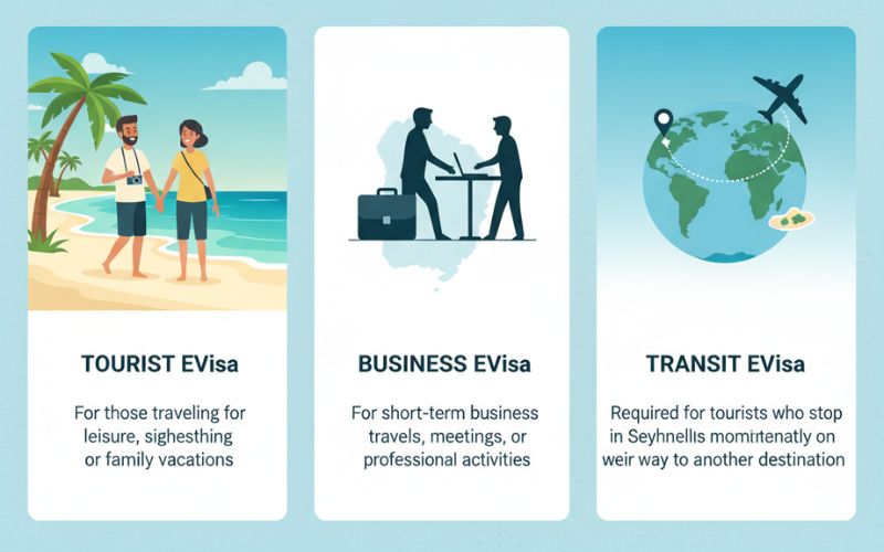 - Transit eVisa: Required for tourists who stop in Seychelles momentarily on their way to another destination.
