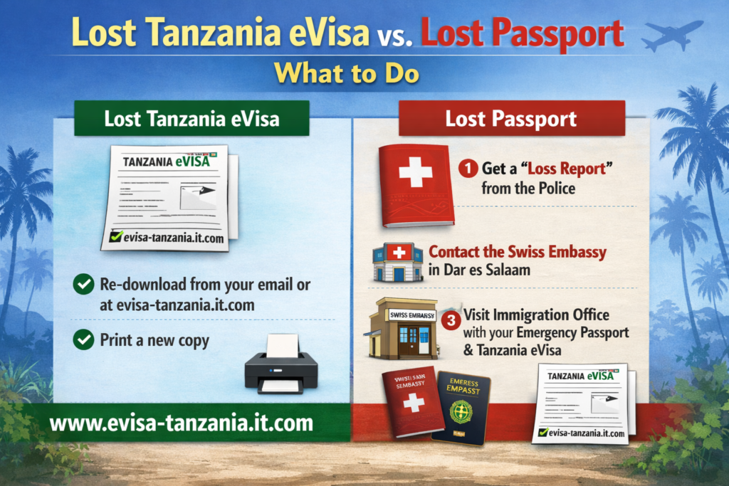 - Lost Passport: 1. Get a "Loss Report" from the police. 2. Contact the Swiss Embassy in Dar es Salaam. 3. Visit an Immigration office with your emergency passport and a copy of your Tanzania eVisa.
